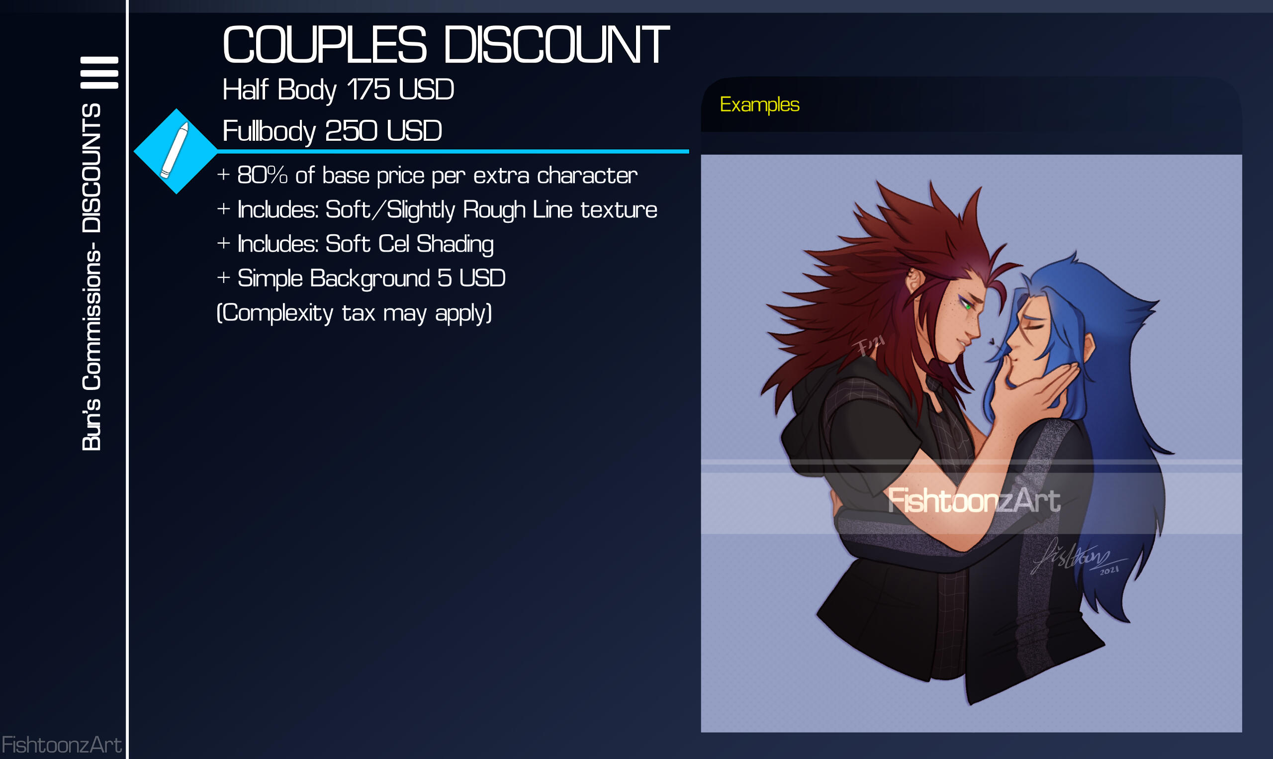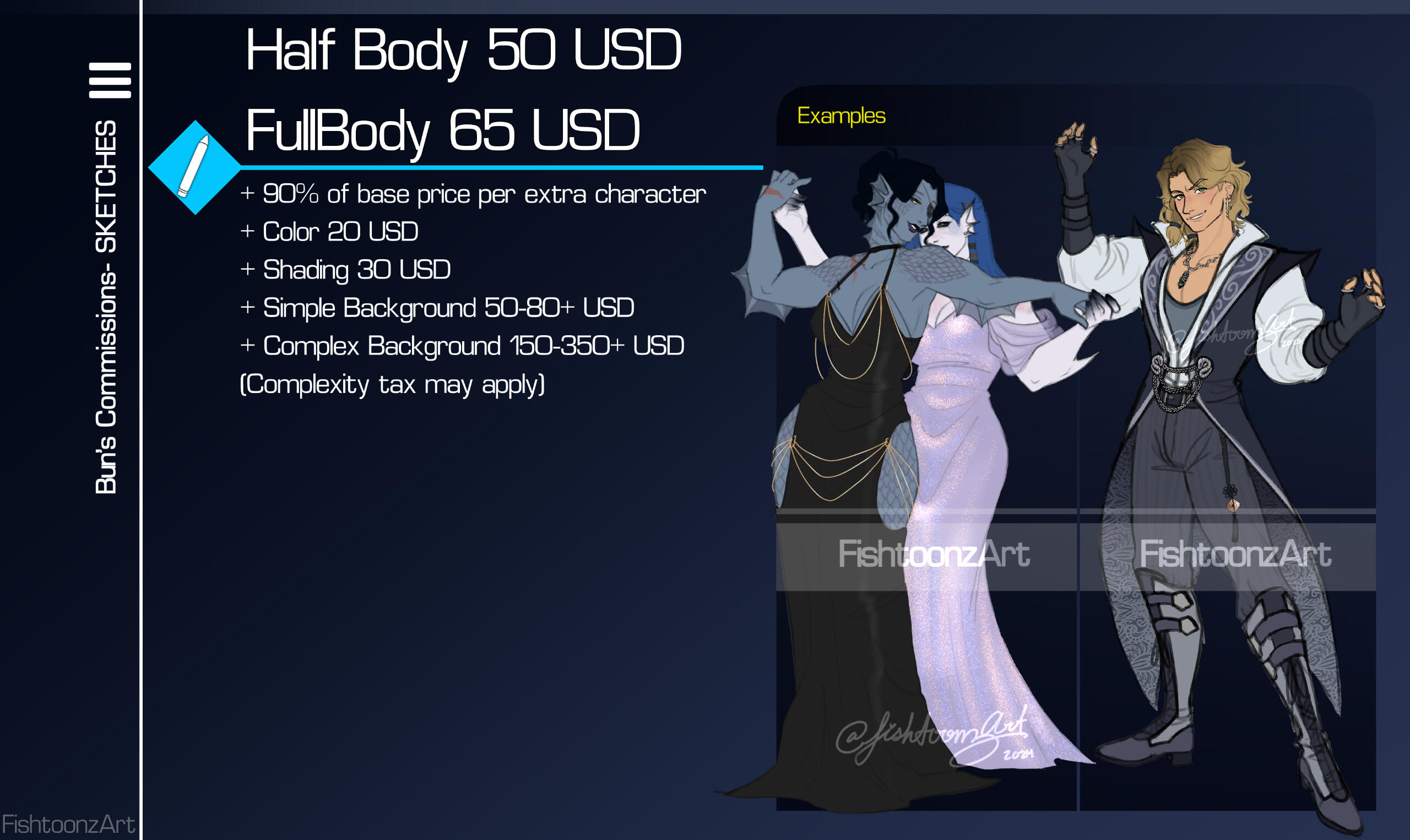 ARTIST RIGHTS:⤐ I have the right to turn down any commission.⤐ I have the right to post any and all commissioned works to my social media pages for advertising purposes/general posting. If you wish for your commission to remain private just ask and I will not post it.CLIENT RIGHTS:⤐ You may print your commission for personal use only.⤐ You may not print your commission for a profit. If you are interested in doing so please reach out to me and we can discuss pricing for commercial use.⤐ You may reupload your commission as long as you provide the proper credit (i.e tagging my account or linking back to my social media)⤐ You may edit or crop your commission in any way you'd like, but you may not use it as reference for your own work.⤐ You may not use any commissioned work I make for you in any AI programs, used for NFTs, or any kind of crypto related scams whatsoever. Doing so will result in me blacklisting you.⤐ If you wish to have me tweak anything small in your commission after it's complete I will happily do so. If it's large redraw there will be a fee discussed for such changes.WILL NOT DRAW:⤐ I will absolutely not, under any circumstances take any type of commission that involves Lolicon, Shotacon, Incest, or Adult/Minor content. I'm not comfortable with that type of content, and do not wish to draw it.⤐ I will also never take any commission that contains hateful content directed at anyone or any community, nor will I draw any political content.⤐ I do not draw heavy gore, but light gore is allowed.⤐ I will never accept AI Generated Content as a reference or example. No exceptions.⤐ (If you're curious about anything else, please feel free to ask. I update this list frequently.)PAYMENT INFORMATION:⤐ Payment is due upfront via PayPal only. If payment is not received within 24 hours after the invoice has been sent to the buyer, the commission will be canceled. Terms for partial payment up front can be discussed via DMs.⤐ Once the invoice has been paid a confirmation message will be sent before commission is started.⤐ Base prices are subject to change according to the complexity, difficulty, and size of the commission.⤐ If you need a deadline for a commission, please DM me to discuss. (RUSH ORDERS WILL HAVE AN EXTRA CHARGE)⤐ Commissions in which a partial payment has been given will be shown a preview of the final product including a large watermark until final payment is received.REFUNDS / ART REVISIONS:⤐ A full refund will be given if the sketch is either not started yet or barely progressed.⤐ A partial refund will be given if the sketch is halfway done or further along.⤐ No refunds will be given once the sketch phase is complete. No exceptions.⤐ You have a total of 2 revisions you can make once the sketch phase is complete. Any revisions after will cost extra.⤐ This does not mean, however, you have unlimited revisions during the sketch phase-- 5 are allowed during the sketch phase.
