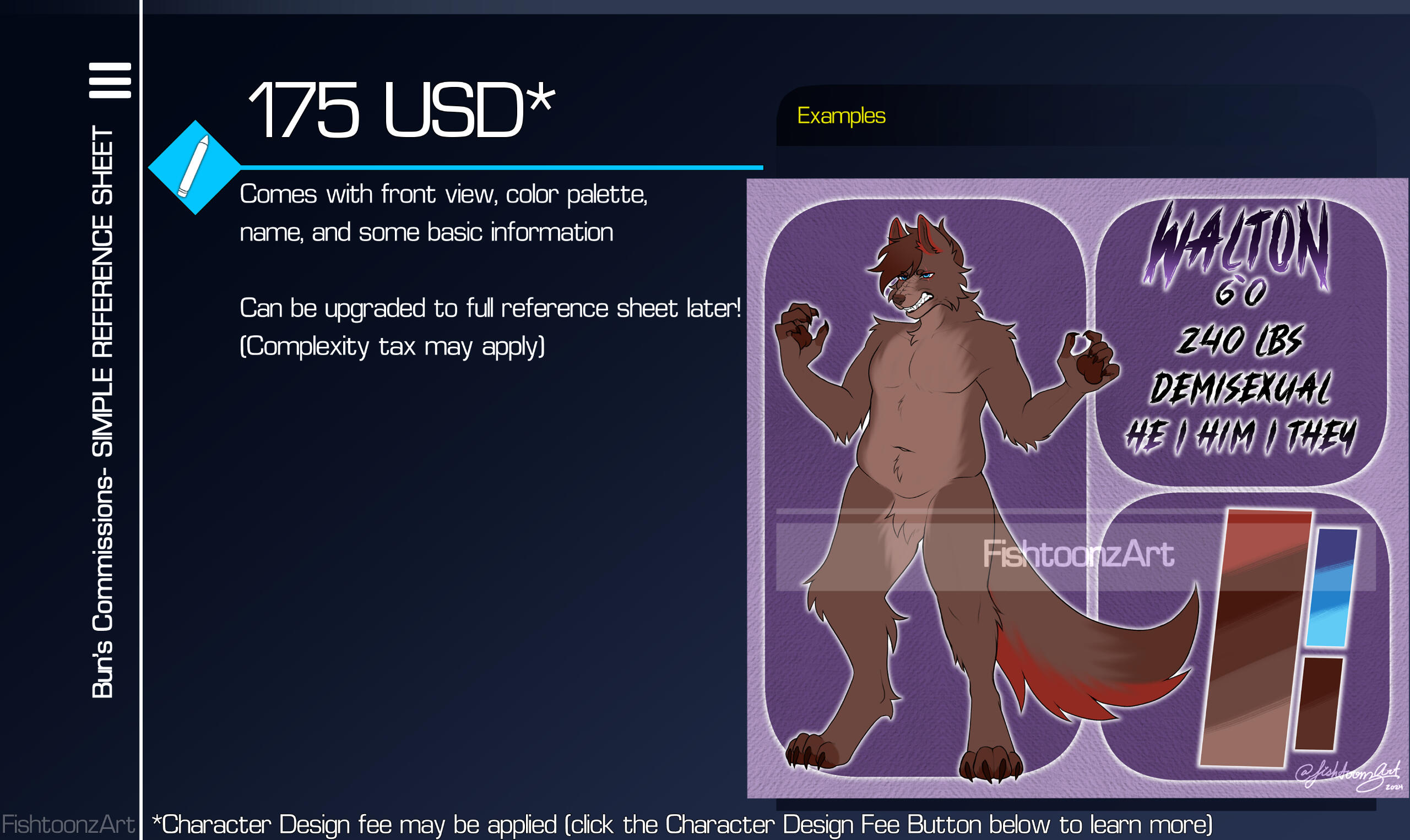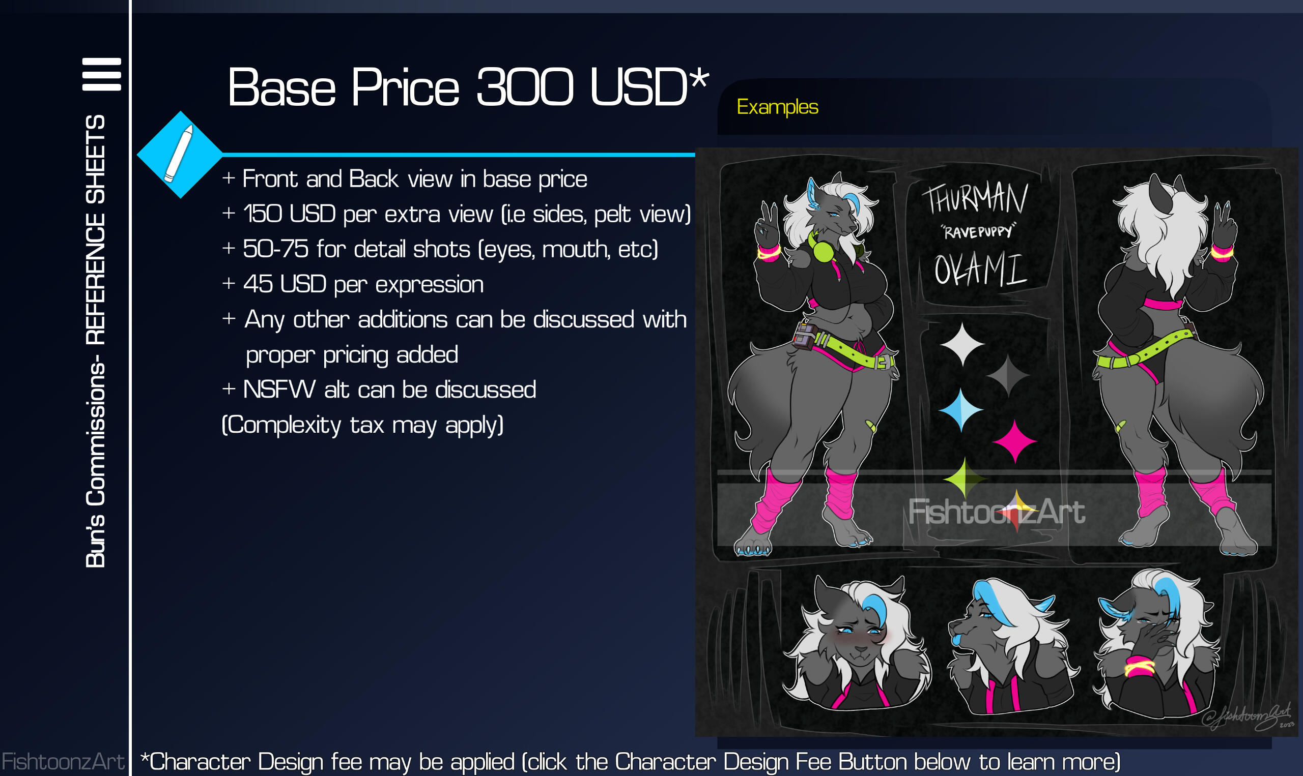 A Character Design Fee can be applied to ANY of my commission types, however this is mainly tied to my reference sheets.The Character Design Fee exists because when making a character from scratch it will take me much more time than usual. Character design is a collaborative effort between the client and the artist, and as such a lot of back and forth will take place.TLDR: It takes a lot longer than a normal commission and requires direct and constant communication between the client and the artist.
